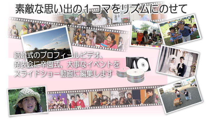 思い出のスナップショットを素敵な音楽にのせてスライドショー動画に編集し、DVD に仕上げます。結婚式のプロフィールビデオやエンドロール、卒園・卒業記念、クラブ活動、発表会等にご利用いただけます。スライドショーには動画も使用可能です。